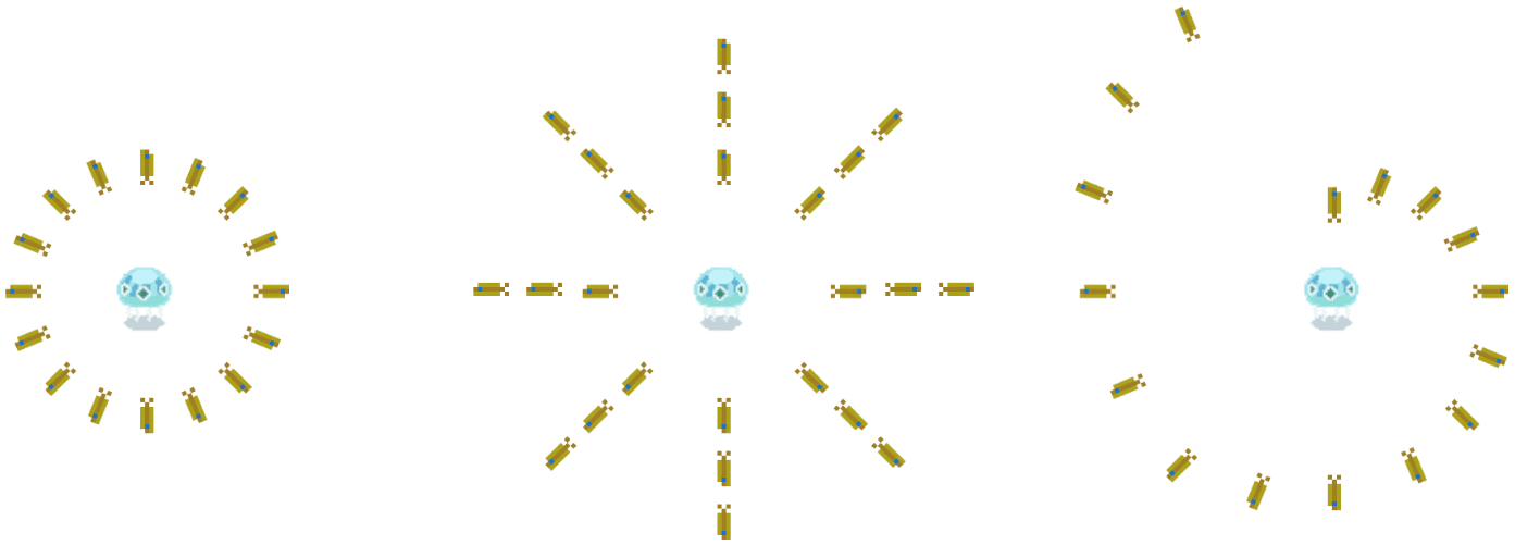 When deciding the bullet patterns for each enemy amongst each level, we focused on three main forms. Rotationally symmetric, fixed angle, and aimed— with modifications such as arcs that can be added to each of these. Generally, patterns should be composed of some static and some aimed components as we introduce different types of both, as well as different combinations, to create interesting patterns and levels.